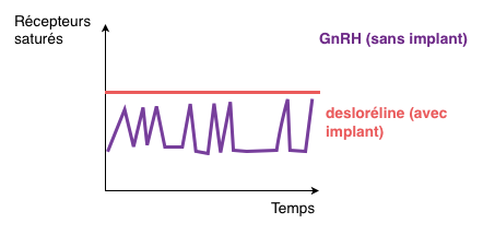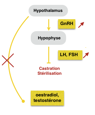 De ce fait, la GnRH ne produit plus de signal pour produire les hormones LH et FSH qui commandent aux gonades (les testicules ou les ovaires) la production des hormones sexuelles (testostérone et oestradiol). Elles ne sont donc plus produites et un effet de castration/stérilisation est obtenu. Le fonctionnement normal de l'axe hormonal est décrit ci-dessous à gauche, celui avec l'implant à droite :