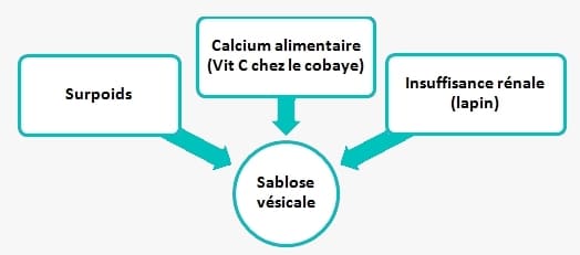 - Les cystites ou inflammation de la vessie surviennent très fréquemment suite à la présence de cristaux ou calculs chez le lapin et le cobaye, dans une moindre mesure lors d'une infection bactérienne ou d'une tumeur vésicale. En effet, ces animaux ont une faible capacité de régulation du taux de calcium : un régime riche en calcium amènera donc à des précipitations minérales dans la vessie. Ce phénomène est appelé "sablose vésicale". Les alimentations à base de foin de luzerne et notamment les granulés (qui en sont souvent constitués) distribués en grande quantité sont un facteur favorisant, tout comme le surpoids. Les calculs urinaires ou urolithiases peuvent se former à tous les niveaux de l'appareil.