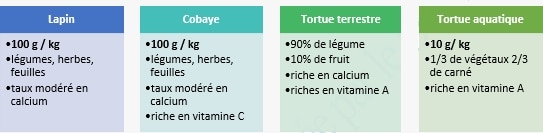 A encourager pour les tortues terrestres, à limiter pour les cobayes et lapins ! Pour ces derniers, privilégiez les 2 colonnes de droite.